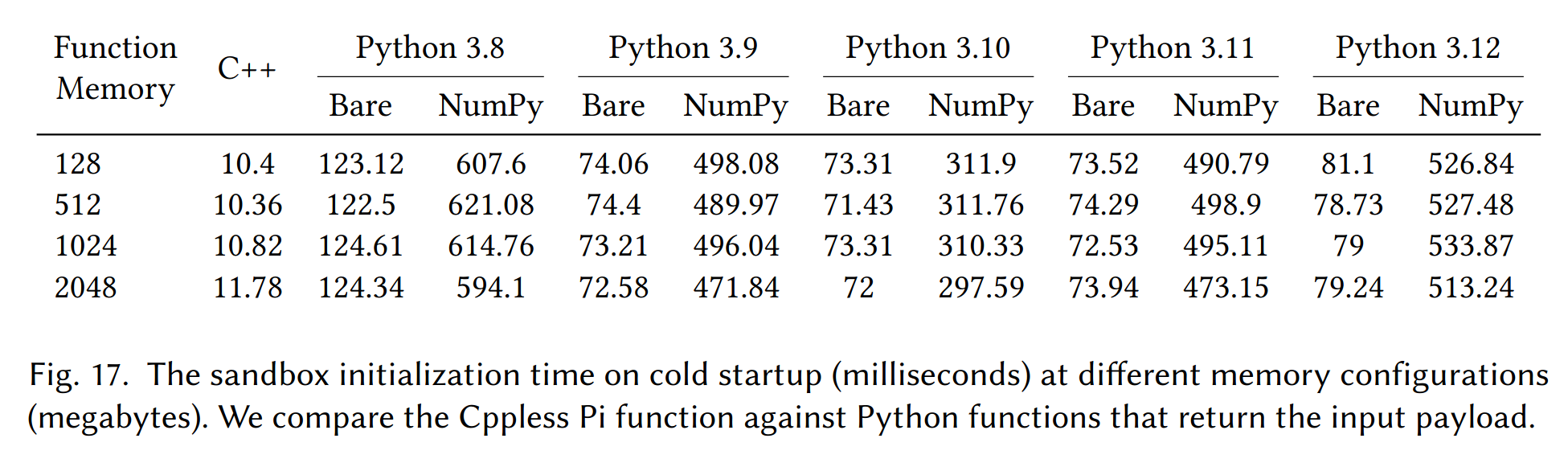Thus, we also executed the microbenchmark 010.sleep that does not use the SDK. There, the init duration for the cold invocation was about ~150ms, which is lower but still higher than expected: we knew from our Cppless paper that the initialization overheads should be much lower!